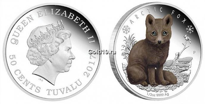 На реверсе серебряной монеты на переднем плане в цвете показан детеныш песца. Позади него изображена птица, сидящая на ветке поваленного дерева. В верхней части монеты полукругом выгравирована надпись – «ARCTIC FOX». Внизу указаны технические характеристики – «1/2oz 9999 Ag». Справа обозначены инициалы дизайнера – «NM» (Natasha Muhl), а также указан знак монетного двора – «Р».